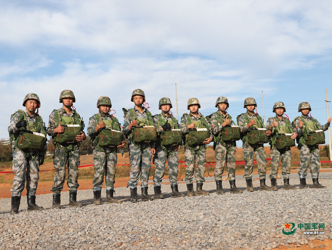 伞降前干部带着特战队员在给自己加油鼓劲。