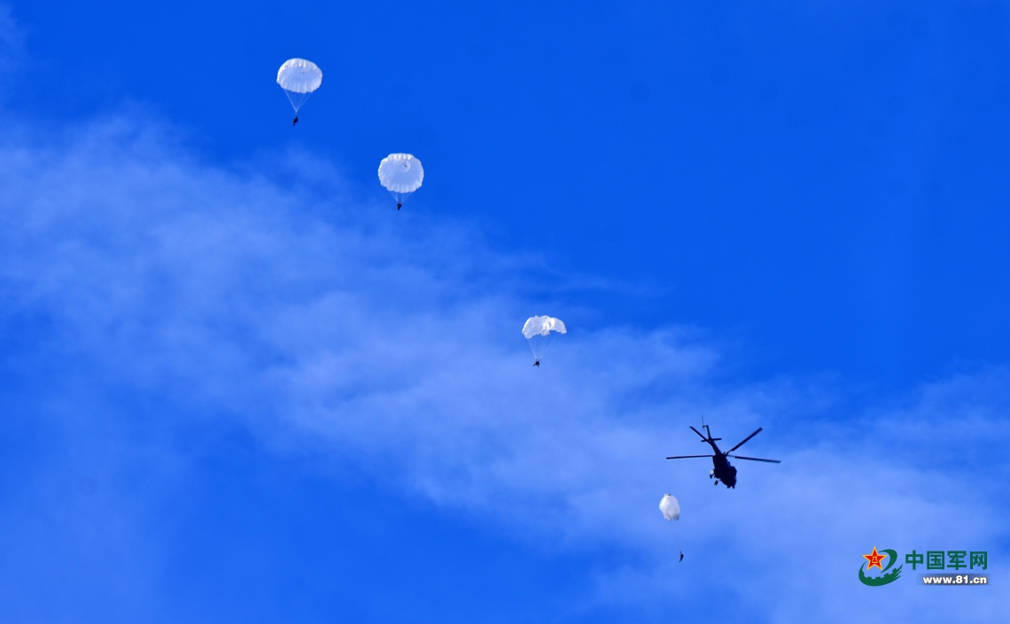 特战队员操纵降落伞向预定着陆点集结。