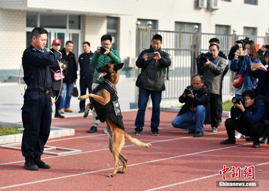 警员展示并介绍训练警犬的技巧。中新社记者 翟羽佳 摄