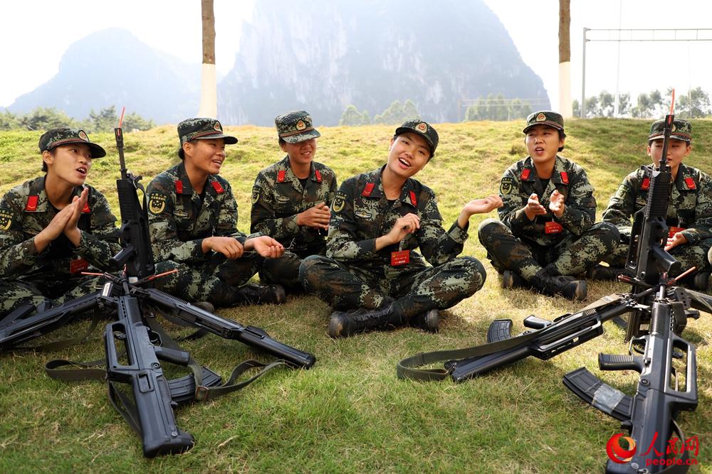 2018年11月27日,武警女兵李嘉琪(前一)在训练间隙带领全班战友唱歌。