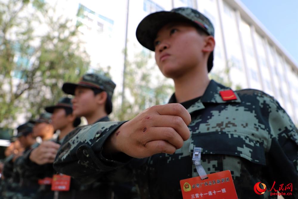 2018年11月27日,一名武警女兵训练中,手上的伤痕体现出“女汉子”风范。