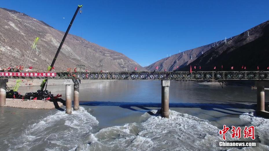 11月30日,经过抢险人员连续7个昼夜的艰苦奋战,川藏交界的国道318公路金沙江大桥战备钢桥成功合龙。中新社发 汪巍 摄