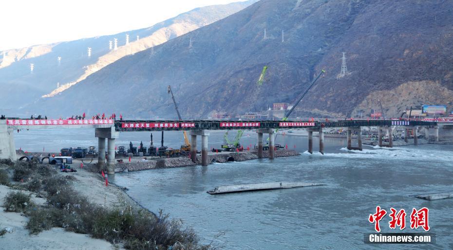 11月30日,经过抢险人员连续7个昼夜的艰苦奋战,川藏交界的国道318公路金沙江大桥战备钢桥成功合龙。中新社发 杨继明 摄