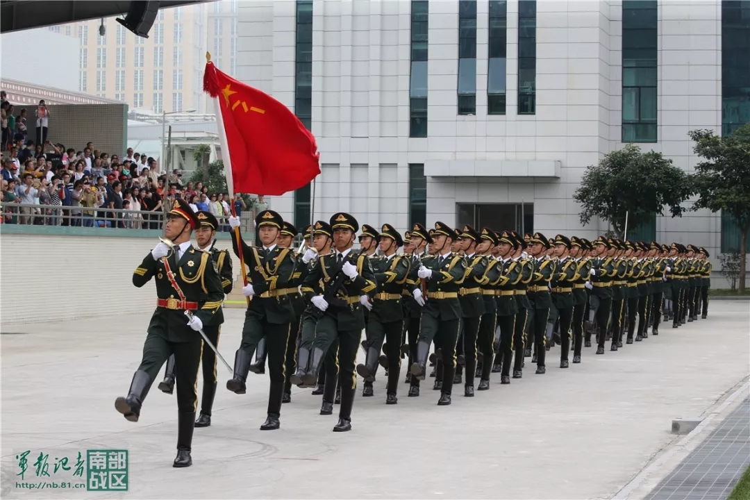 ▲驻澳门部队军营开放仪仗队通过观礼台