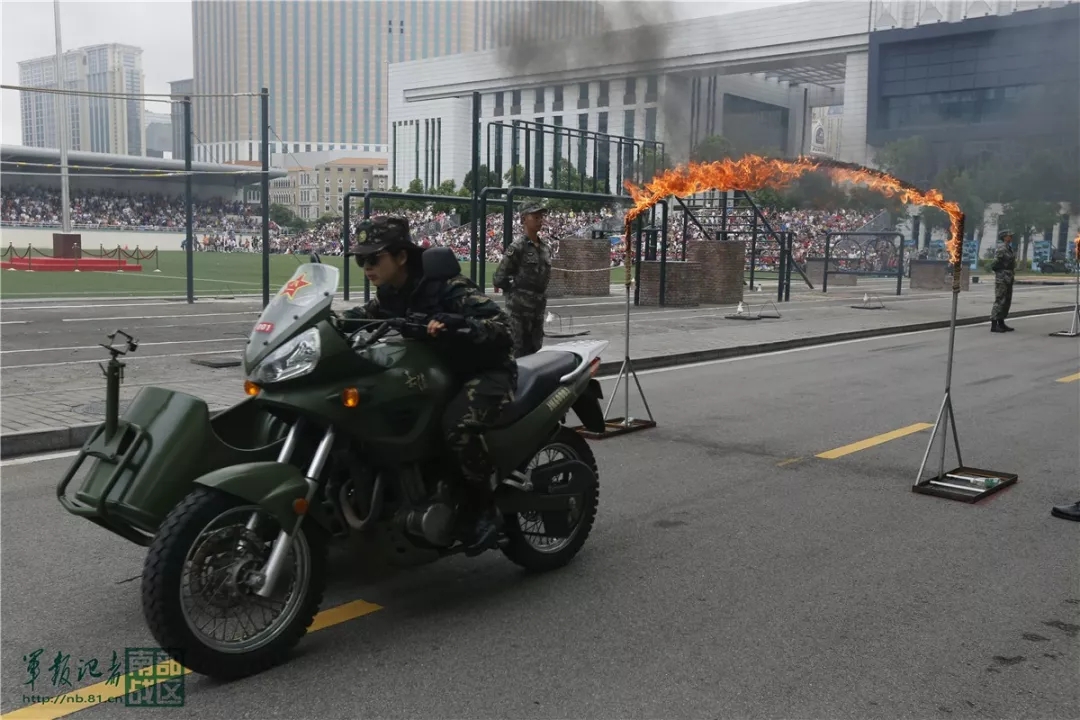 ▲驻澳门部队五一军营开放女兵驾驶摩托车穿越火障