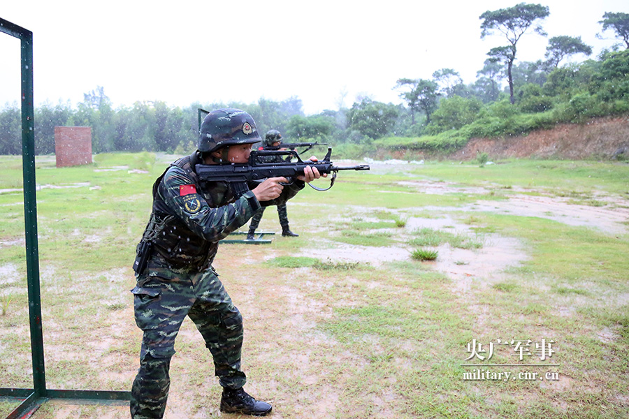 考核当天,特战队员在大雨中进行突入识别射击考核。