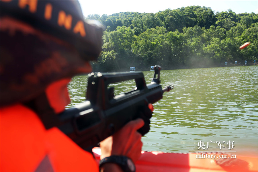 特战队员在皮划艇上对固定目标进行射击。肖磊摄