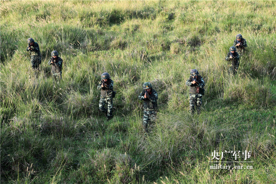 特战队员在草丛中成“前三角”队形搜索前进。雷辙摄