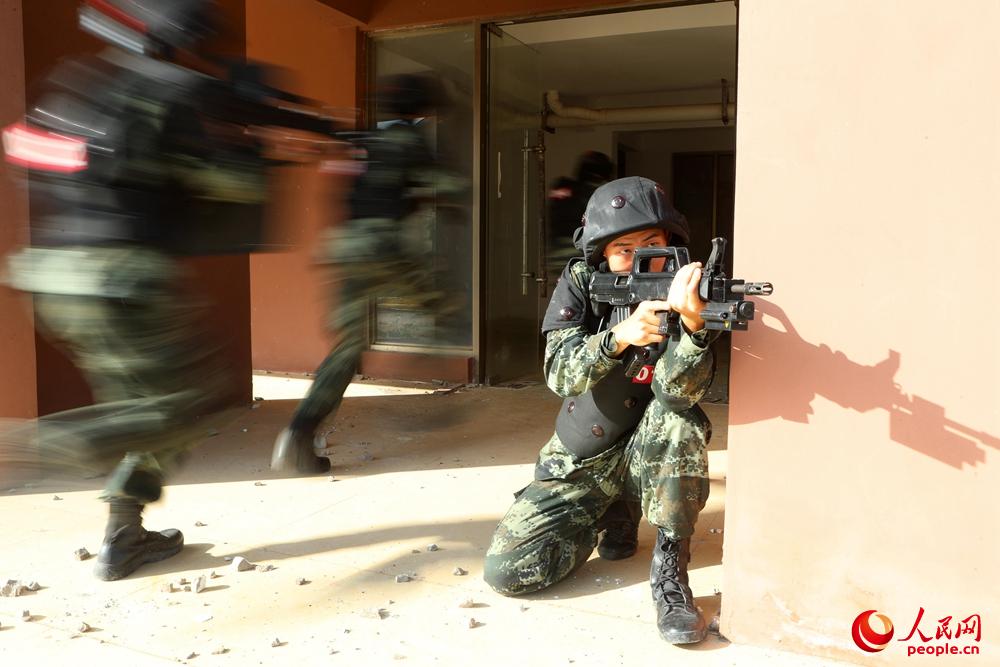 在队友的掩护下,特战队员快速进入目标藏匿区域。