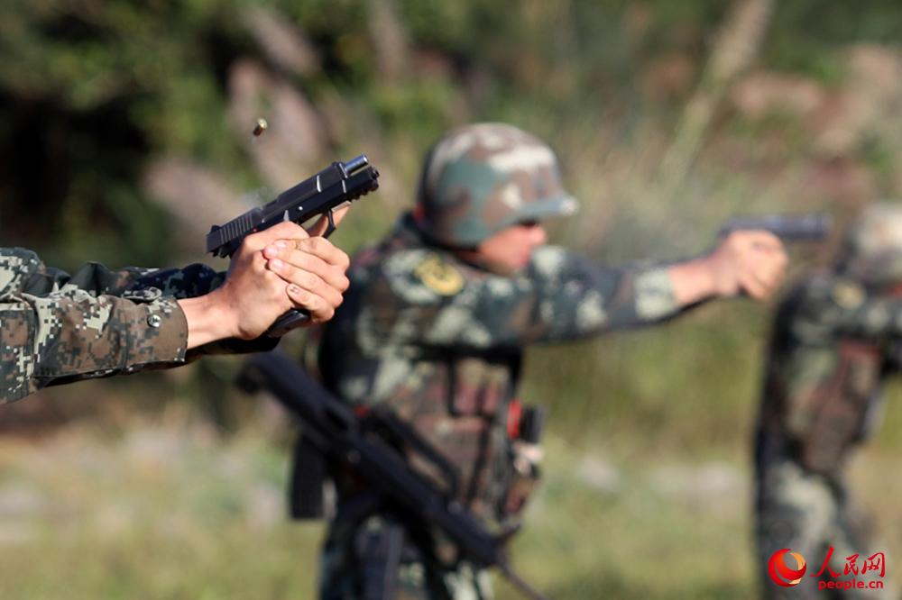 特战队员在进行手枪射击时弹壳出膛瞬间。