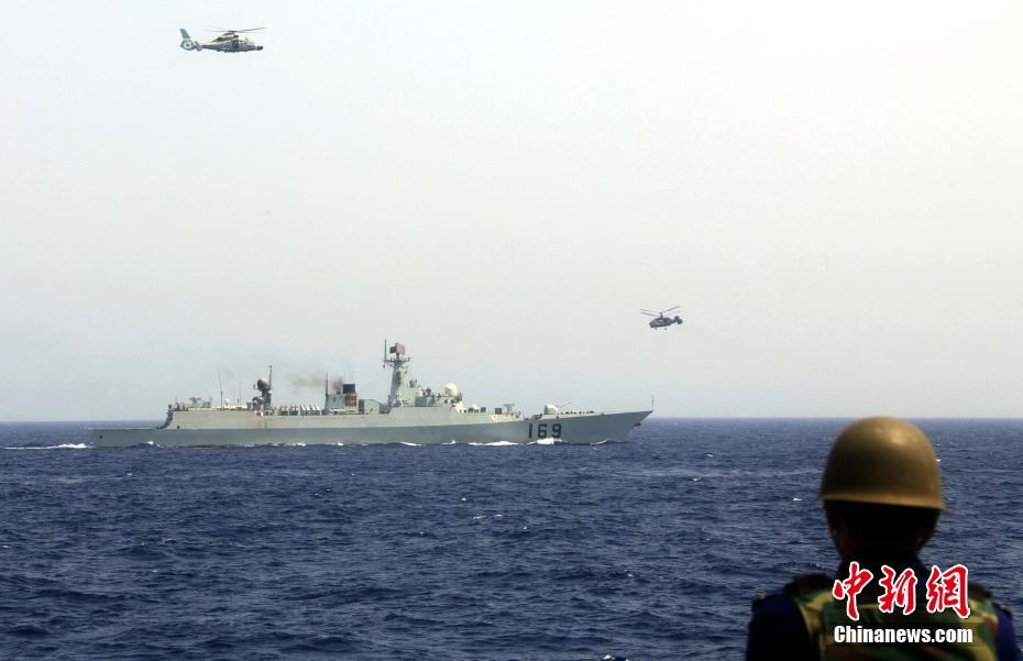 改革开放40年来,中国人民解放军坚定不移走中国特色强军之路,全面推进国防和军队现代化。这支威武之师走过了波澜壮阔的光辉岁月,正朝着建设世界一流军队的目标不断奋进。2009年4月16日,中国海军第一、第二批护航编队在亚丁湾海域实施第二次共同护航。两批护航编队的两架舰载直升机同步起飞,进行空中护航巡逻。中新社记者 孙自法 摄 (图文整理 满会乔)