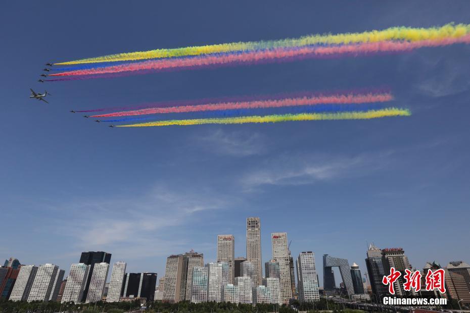 改革开放40年来,中国人民解放军坚定不移走中国特色强军之路,全面推进国防和军队现代化。这支威武之师走过了波澜壮阔的光辉岁月,正朝着建设世界一流军队的目标不断奋进。2015年9月3日上午,纪念中国人民抗日战争暨世界反法西斯战争胜利70周年大会在北京隆重举行。受阅领队机梯队飞过北京CBD上空。中新社记者 熊然 摄 (图文整理 满会乔)