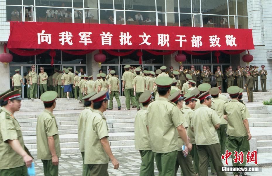 改革开放40年来,中国人民解放军坚定不移走中国特色强军之路,全面推进国防和军队现代化。这支威武之师走过了波澜壮阔的光辉岁月,正朝着建设世界一流军队的目标不断奋进。1988年8月2日,总政首批文职干部大会在北京军区礼堂举行。中新社发 乔天富 摄 (图文整理 满会乔)