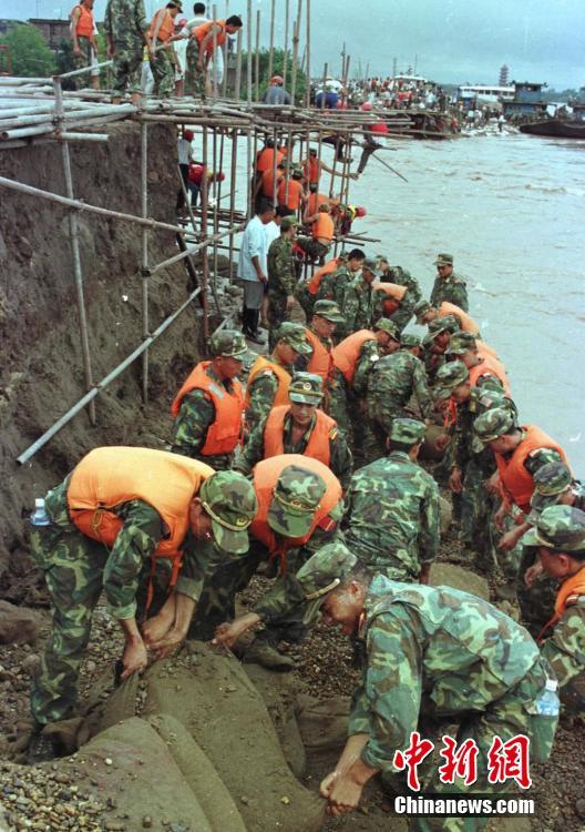 改革开放40年来,中国人民解放军坚定不移走中国特色强军之路,全面推进国防和军队现代化。这支威武之师走过了波澜壮阔的光辉岁月,正朝着建设世界一流军队的目标不断奋进。1998年,解放军官兵在湖南抗洪抢险。中新社记者 赵伟 摄 (图文整理 满会乔)
