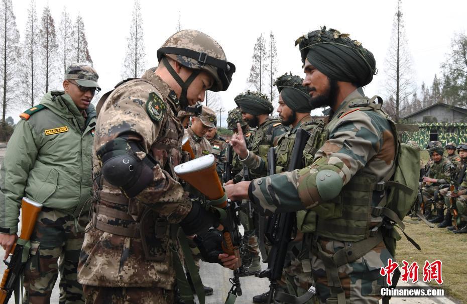 12月11日,“携手-2018”中印陆军反恐联合训练在四川成都开训。此次联训中印双方参训官兵将打乱原有建制,混编重组为A连和B连,按照适应性训练、混编同训和综合演练3个阶段,共同完成“城镇条件下街区联合反恐作战”课题训练。图为中印双方官兵互换武器进行射击训练。安源 摄