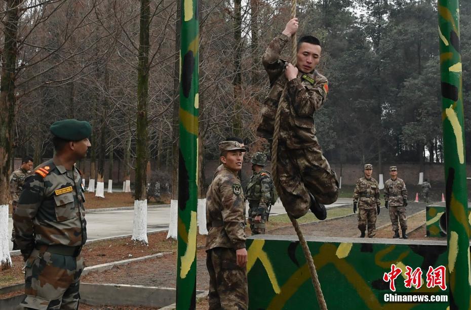 12月11日,“携手-2018”中印陆军反恐联合训练在四川成都开训。此次联训中印双方参训官兵将打乱原有建制,混编重组为A连和B连,按照适应性训练、混编同训和综合演练3个阶段,共同完成“城镇条件下街区联合反恐作战”课题训练。图为中方参训队员利用荡绳通过障碍。安源 摄