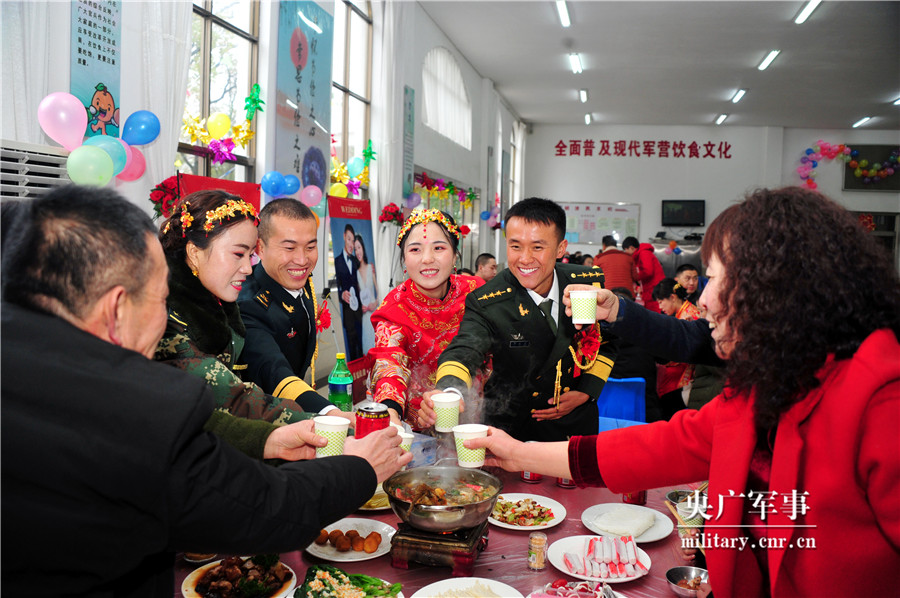 “‘常规导弹第一旅’的官兵们大家好,我是《新闻联播》主播郭志坚,祝今天结婚的新人们,白头偕老……”“战友们大家好,我是你们的老朋友李丹阳,祝‘常规导弹第一旅’的新人们,新婚快乐……”让官兵没想到的是,在祝福新人环节,我部领导特意了安排“惊喜”:新人转身望向荧屏,一段段祝福视频纷至沓来,既有宋一平、劳春燕、魏晨霞等央视知名主持,又有刘金山、李大强、邹德江等影视明星,还有奥运冠军金紫薇的个人祝福,形式繁多、情真意切。该旅政治工作部主任杨鹤立说,能邀请到这些平时只能在电视里出现的神秘嘉宾,为婚礼录制祝福视频,不仅是对新人新婚的祝贺,更多的是对军人保家卫国辛勤付出的“点赞”。