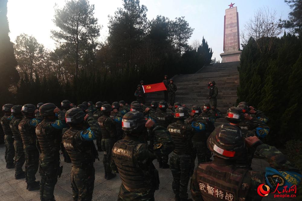 在松滋市洈水镇九岭岗革命烈士公园,特战队员们沿着蜿蜒的山路,来到九岭岗烈士纪念碑前,回顾革命先烈为了国家和人民不懈奋斗、英勇献身的光辉历史。接着,在徐向前元帅题字碑前,全体党员同志面对鲜红的党旗,庄严宣誓,重温入党时的铮铮誓言,进一步坚定了共产党人的理想信念。