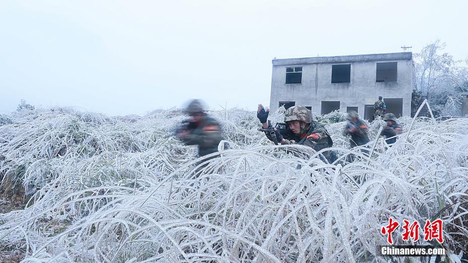 12月12日,武警贵州总队举行第四季度“魔鬼周”极限训练,因受冷空气影响,贵州多地出现凝冻天气,在黔东南片区,特战队员们就置身于恶劣的自然环境当中,进行极限体能、武装奔袭、山地捕歼、通过染毒区、恶劣天气条件下射击等30多个课目训练,在恶劣环境下锤炼出特战“尖刀”。 图为特战队员正在进行战术训练。黄事成 摄