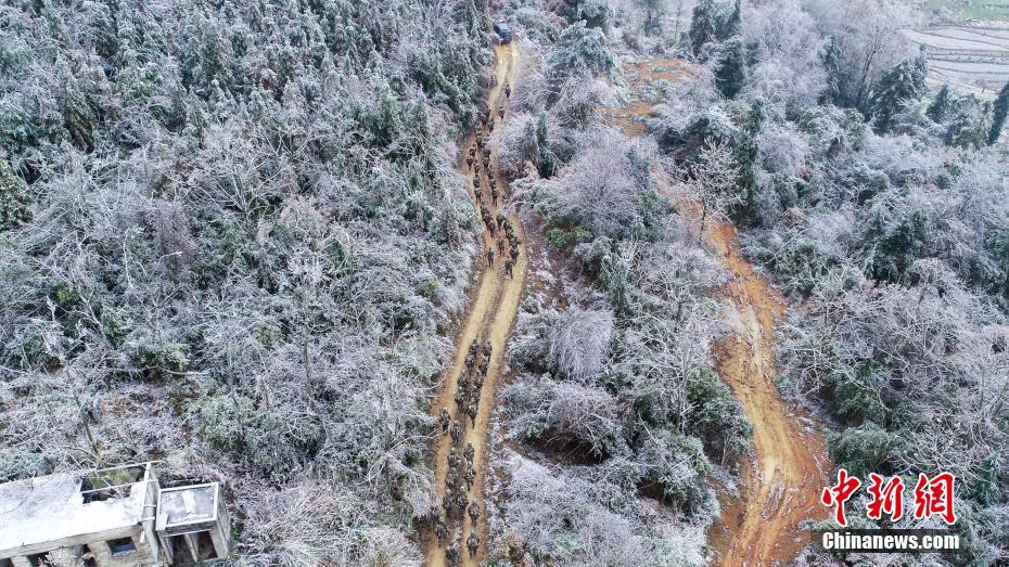 12月12日,武警贵州总队举行第四季度“魔鬼周”极限训练。因受冷空气影响,贵州多地出现凝冻天气,在黔东南片区,特战队员们就置身于恶劣的自然环境当中,进行极限体能、武装奔袭、山地捕歼、通过染毒区、恶劣天气条件下射击等30多个课目训练,在恶劣环境下锤炼出特战“尖刀”。图为特战队员正在徒步行军路上。黄事成 摄