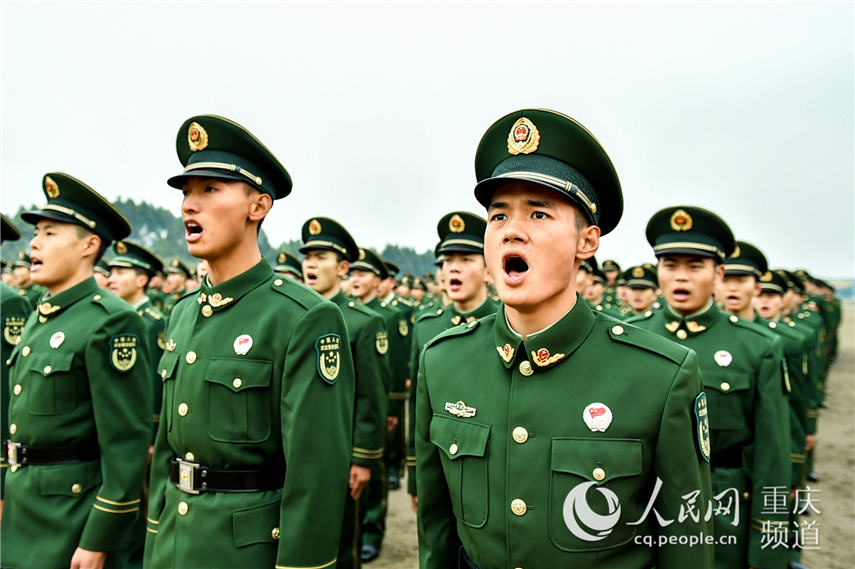 12月13日,武警重庆总队新兵团新兵在授衔仪式中齐声高唱国歌。唐炜东 摄