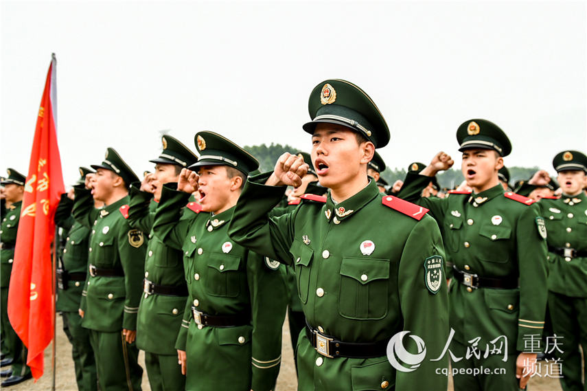 人民网重庆12月14日电 “我是中国人民武装警察,我宣誓,服从中国共产党的领导,全心全意为人民服务……”13日,武警重庆总队新兵团在某基地举行2018年度入伍新兵授衔仪式。新兵们高举右拳,嘹亮的人民武装警察誓词响彻云霄。那一刻,庄严而神圣,新兵们完成向一名合格武警战士的蜕变。
