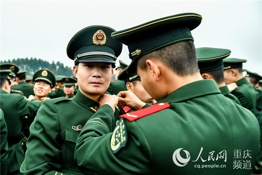 12月13日,武警重庆总队新兵团新兵在授衔仪式中互相佩戴警衔。唐炜东 摄