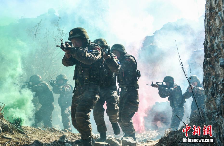 12月14日至17日,武警西藏总队组织千余名特战队员围绕15类54个科目进行训练。据了解,此次极限训练通过战术课题牵引、作战进程推进、复杂情况诱导、陌生地域锤炼等方式突出极限属性,全方位锤炼打磨部队,加快提升特战分队反恐实战能力。图为12月16日,特战队员进行居民区追剿科目训练。中新社发 余文彬 摄