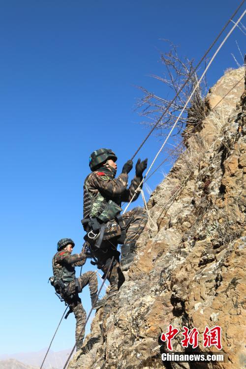 12月14日至17日,武警西藏总队组织千余名特战队员围绕15类54个科目进行训练。据了解,此次极限训练通过战术课题牵引、作战进程推进、复杂情况诱导、陌生地域锤炼等方式突出极限属性,全方位锤炼打磨部队,加快提升特战分队反恐实战能力。图为12月15日,特战队员在高海拔陌生地域进行山体攀岩训练。中新社发 余文彬 摄