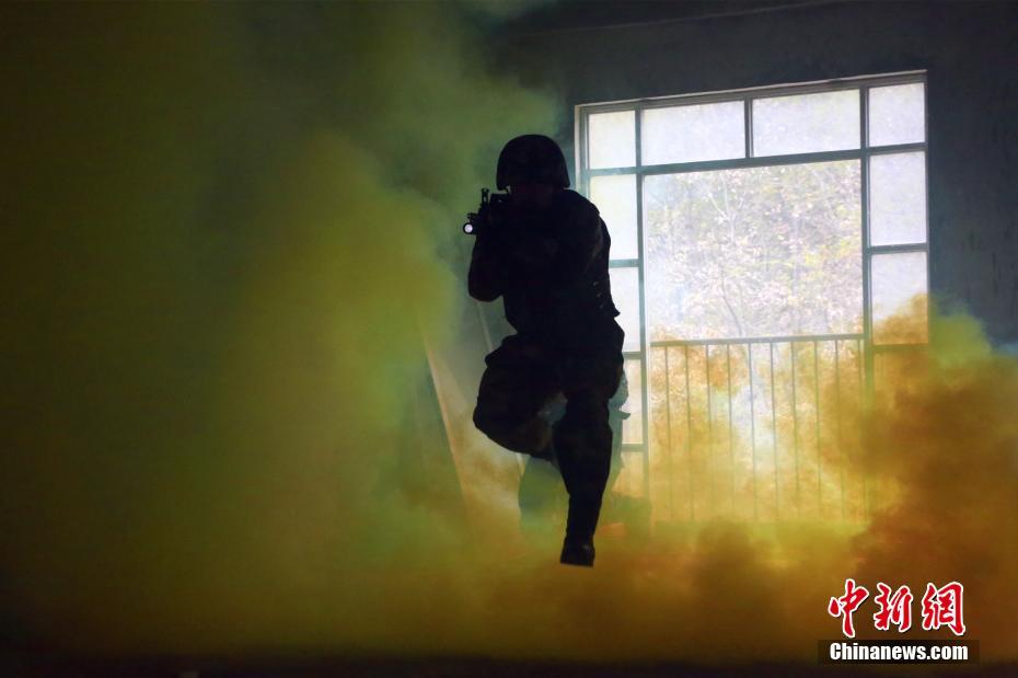 训练处置突发事件时进行楼房突入。杨辰 摄
