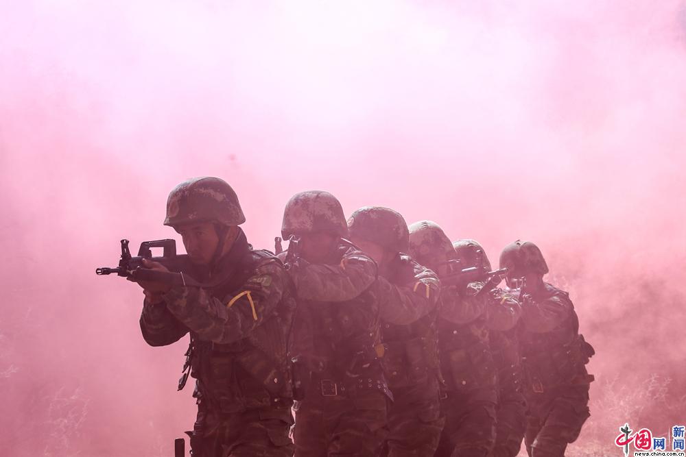 特战队员在山地追剿科目训练中快速通过染“毒”区。 余文彬 摄