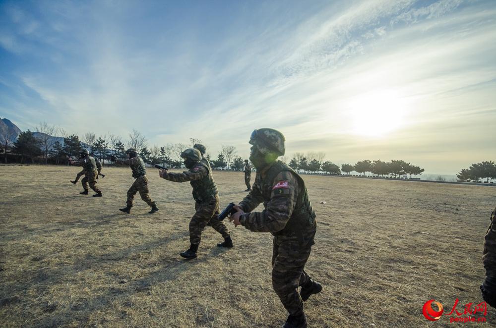 特战队员在空旷地形区域进行手枪快速识别射击。强健 摄