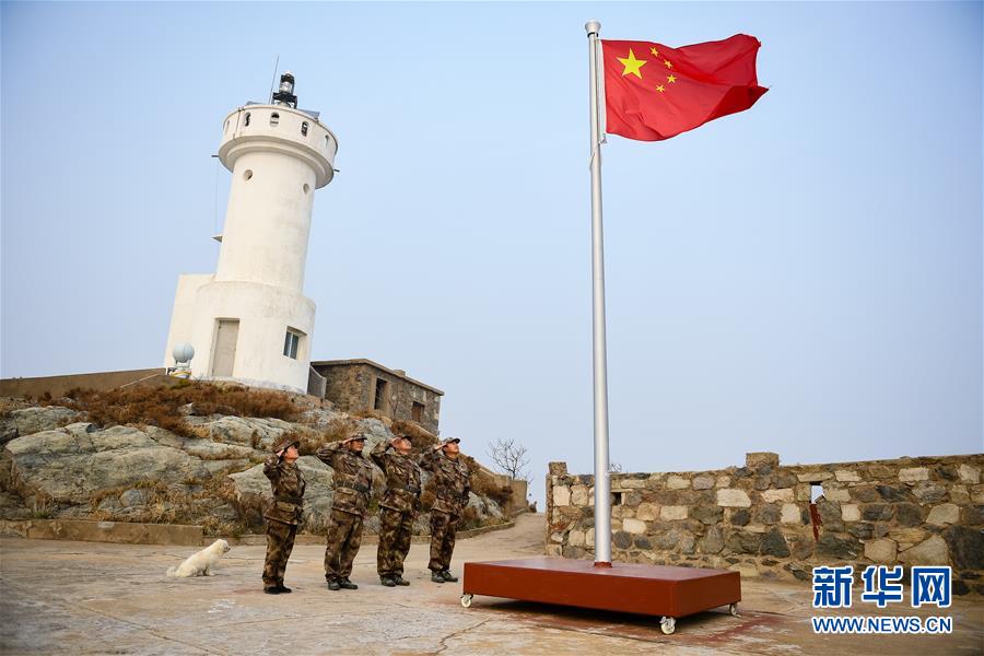 王仕花(左一)在开山岛上和轮值民兵一起向国旗敬礼(11月27日摄)。 新华社记者李响摄