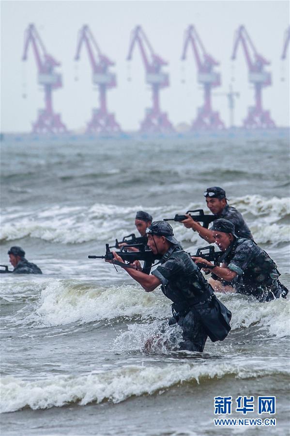 陆军第71集团军某旅“王杰班”的战士在海训期间进行抢滩登陆训练(2016年7月20日摄)。 新华社发(王磊 摄)