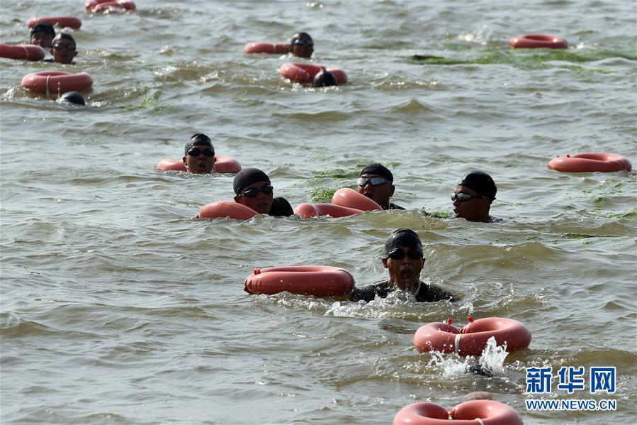 陆军第71集团军某旅“王杰班”的战士在进行武装泅渡训练(7月17日摄)。 新华社发(王磊 摄)
