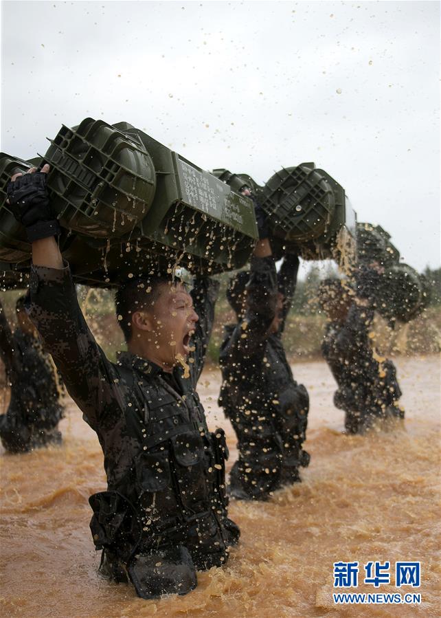 陆军第71集团军某旅“王杰班”的战士在野外训练场进行泥潭极限体能训练 (8月26日摄)。 新华社发(赵聪 摄)