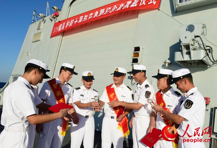 海军第三十批护航编队在亚丁湾举行护航十周年庆典暨纪念章佩戴仪式