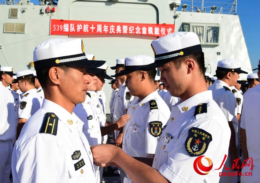海军第三十批护航编队在亚丁湾举行护航十周年庆典暨纪念章佩戴仪式