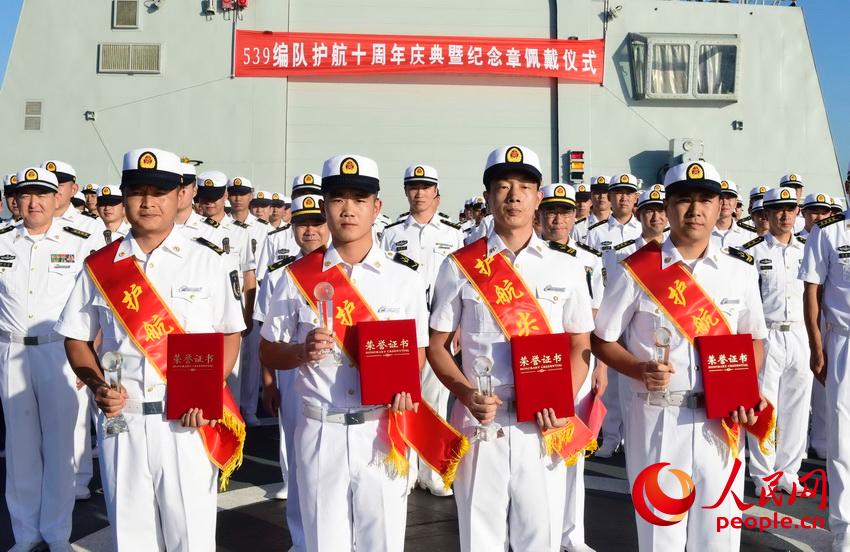 海军第三十批护航编队在亚丁湾举行护航十周年庆典暨纪念章佩戴仪式