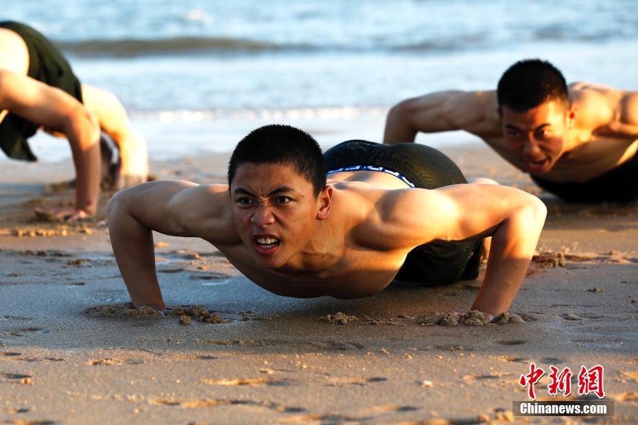 近日,参加武警福建总队福建莆田片区第四季度“魔鬼周”训练的武警官兵,来到莆田市秀屿区某海滩开展极限大练兵训练。据悉,此次“魔鬼周”训练充分结合福建沿海地域特点,设置了贴近实战的海滩训练内容。图为海滩俯卧撑训练。刘欢 摄
