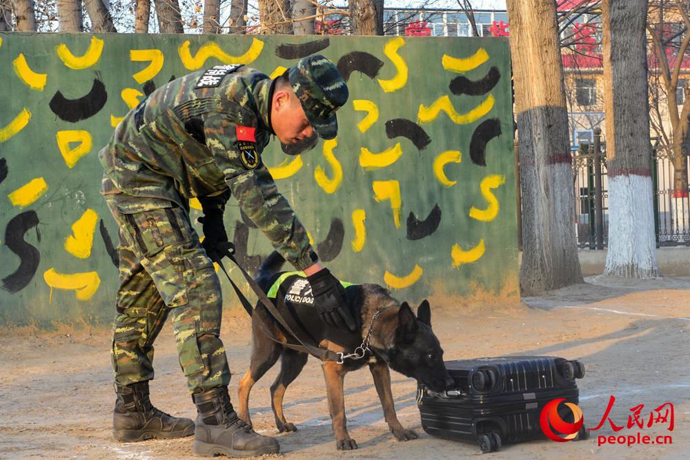 警犬进行行李箱搜爆训练。(袁浩翔摄)