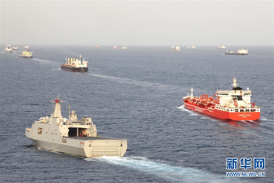 中国海军第6批护航编队在亚丁湾海域给中外商船护航(2010年9月3日摄)。