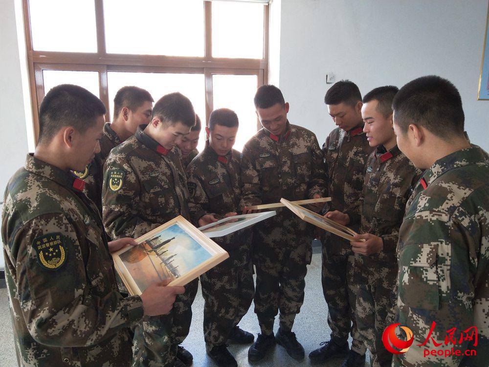 一幅漫画记录一个故事,一幅漫画见证一段成长。细细品味军营中的每一幕,都充满着战友情深。图为新兵们对顾广的画作爱不释手。姜润邈摄