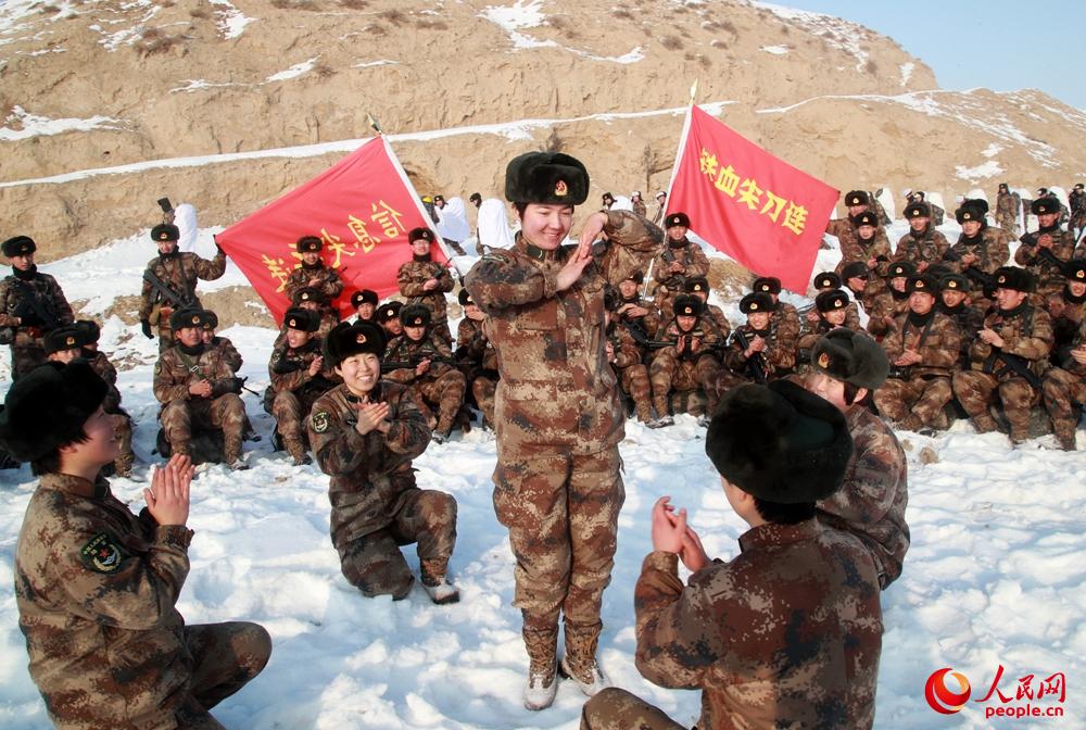 休息间隙,女兵们为战友表演文艺节目。袁凯 摄