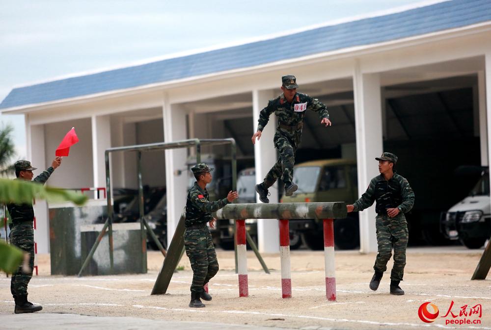 400米障碍科目中,参赛队员快速越过障碍物。