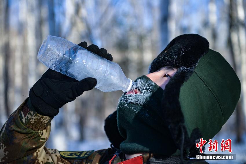 近日,武警吉林省总队机动支队全体开展了新年度野营拉练。拉练期间,官兵们在严寒恶劣天候条件下每天常态化徒步行军30公里,负重25公斤,穿插进行强行军、急行军、抢占高地、实弹射击、捕歼战斗等雪地综合科目。图为武警官兵在严寒中饮水。刘丰 摄