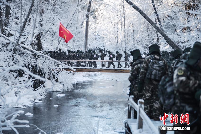近日,武警吉林省总队机动支队全体开展了新年度野营拉练。拉练期间,官兵们在严寒恶劣天候条件下每天常态化徒步行军30公里,负重25公斤,穿插进行强行军、急行军、抢占高地、实弹射击、捕歼战斗等雪地综合科目。万广旭 摄