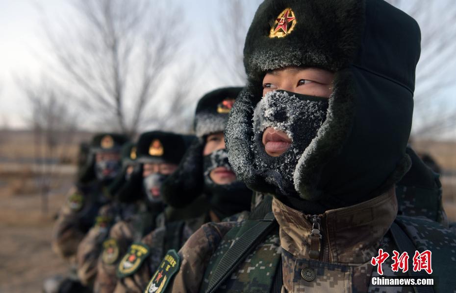 近日,北部战区陆军某联合训练基地紧贴实战组织冬季行军演练。本次演练着重查找部队在严寒条件下备战打仗存在的短板弱项和武器装备操作使用难题,为提升部队战斗力和组训承训能力摸准方向。图为战士在严寒环境下呼气成冰。 中新社发 董天渠 摄