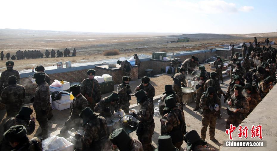 近日,北部战区陆军某联合训练基地紧贴实战组织冬季行军演练。本次演练着重查找部队在严寒条件下备战打仗存在的短板弱项和武器装备操作使用难题,为提升部队战斗力和组训承训能力摸准方向。图为野外就餐。 中新社发 张雷锋 摄