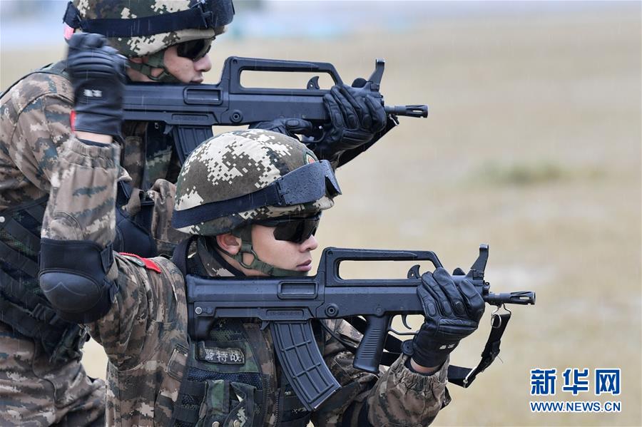 武警福建总队机动支队特战大队官兵在小队战术训练中急停射击(1月5日摄)。 新华社发(李涛 摄)